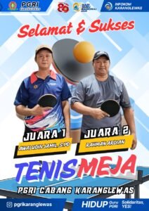 Banyumas, Jawapost.net – Dua alumni MI Ma’arif NU 01 Pangebatan menorehkan prestasi membanggakan pada kejuaraan tenis meja dalam rangka HUT ke-80 PGRI dan Hari Guru Nasional (HGN) 2025 di Kecamatan Karanglewas, Rabu (12/11/2025).