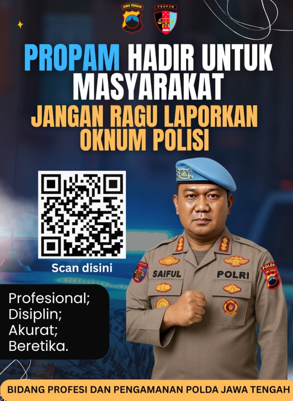 Melalui layanan ini, masyarakat dapat melaporkan secara langsung dugaan pelanggaran disiplin, etika, maupun tata tertib yang dilakukan anggota Polri hanya dengan memindai barcode yang tersedia di lokasi strategis, seperti kantor pelayanan publik, pos polisi, hingga media sosial resmi Polda Jateng.