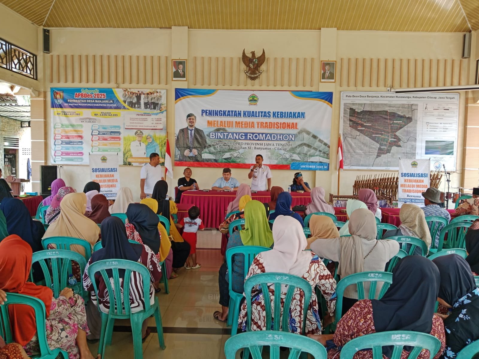 CILACAP (Jawapost.Net) – Anggota DPRD Provinsi Jawa Tengah Komisi A, dari Partai Amanat Nasional (PAN) Bintang Romadhon, menggelar kegiatan bertajuk “Peningkatan Kualitas Kebijakan Melalui Media Tradisional” di Pendopo Desa Banjareja, Kecamatan Nusawungu, Kabupaten Cilacap. Rabu (15/10/2025).