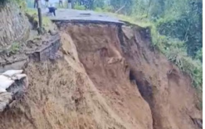Tebing penahan jalan ambrol setelah diguyur hujan deras semalaman. Sebelumnya, badan jalan di titik tersebut sudah sempat tergerus dan hanya bisa dilalui kendaraan roda dua.