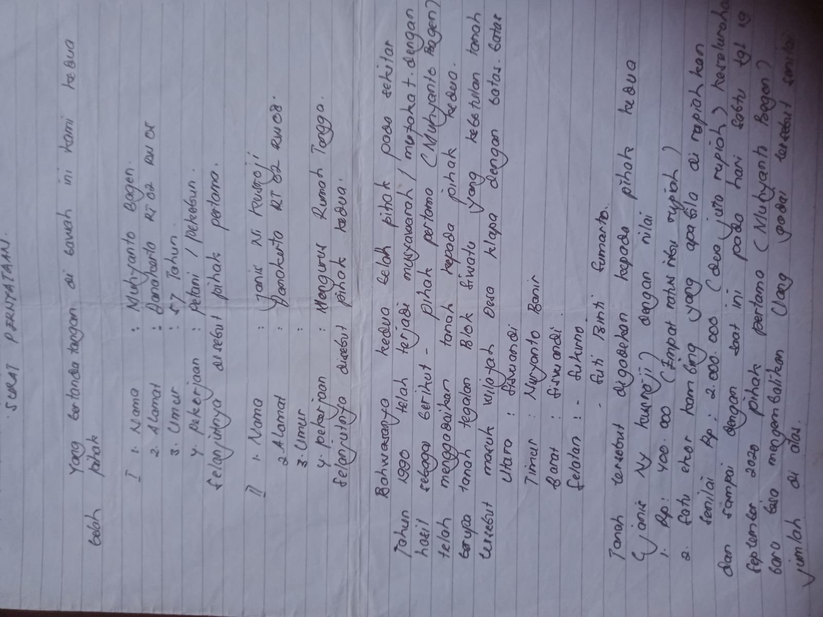 Permintaan tersebut kemudian disepakati dan dituangkan dalam surat pernyataan bermaterai yang disaksikan oleh tujuh orang, terdiri dari unsur perangkat desa dan keluarga pihak Janis. Namun setelah kewajiban dipenuhi, Muhyanto justru mendapati bahwa tanah miliknya telah beralih nama dan tercatat atas nama pihak lain. Proses balik nama itu diduga dilakukan tanpa persetujuan dan tanpa sepengetahuan dirinya sebagai pemilik sah.