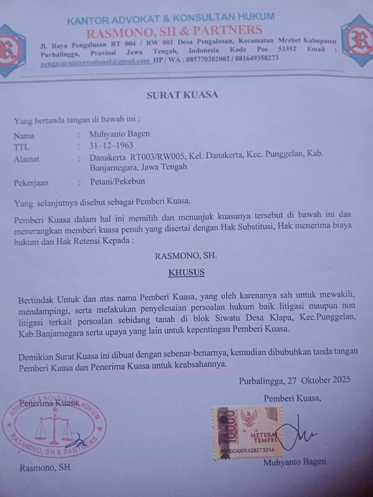 Kuasa hukum Muhyanto Bagen, Rasmono, S.H., menyampaikan bahwa pihaknya telah menerima kuasa sejak 27 Oktober 2025 dan segera mengupayakan penyelesaian secara administratif. Namun, sikap diam pemerintah desa terhadap surat permohonan mediasi dinilai sebagai bentuk pengabaian terhadap fungsi pelayanan publik, khususnya dalam urusan pertanahan.