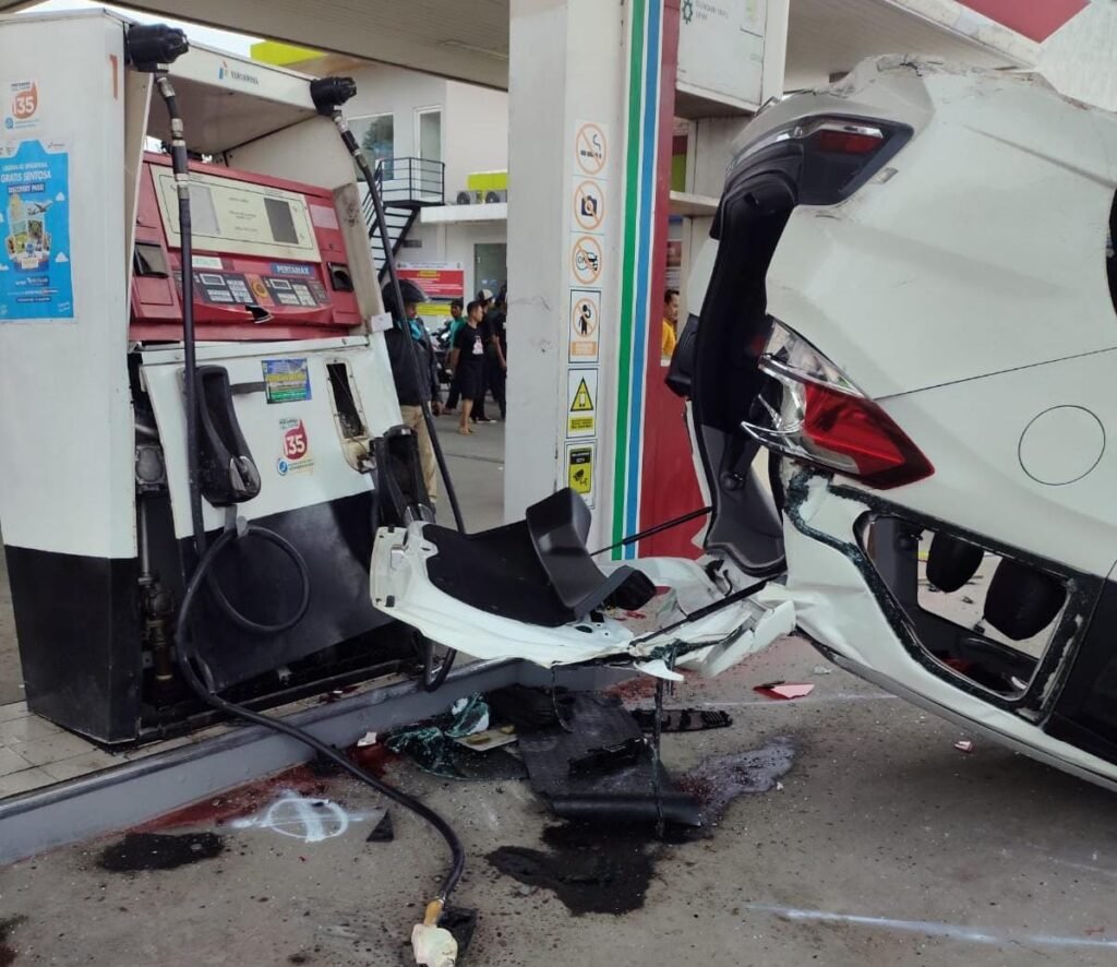 “Kendaraan menabrak pembatas taman SPBU lalu terguling. Dalam posisi terguling, mobil membentur sepeda motor yang sedang mengisi BBM serta operator SPBU di sekitar dispenser,” ujarnya.