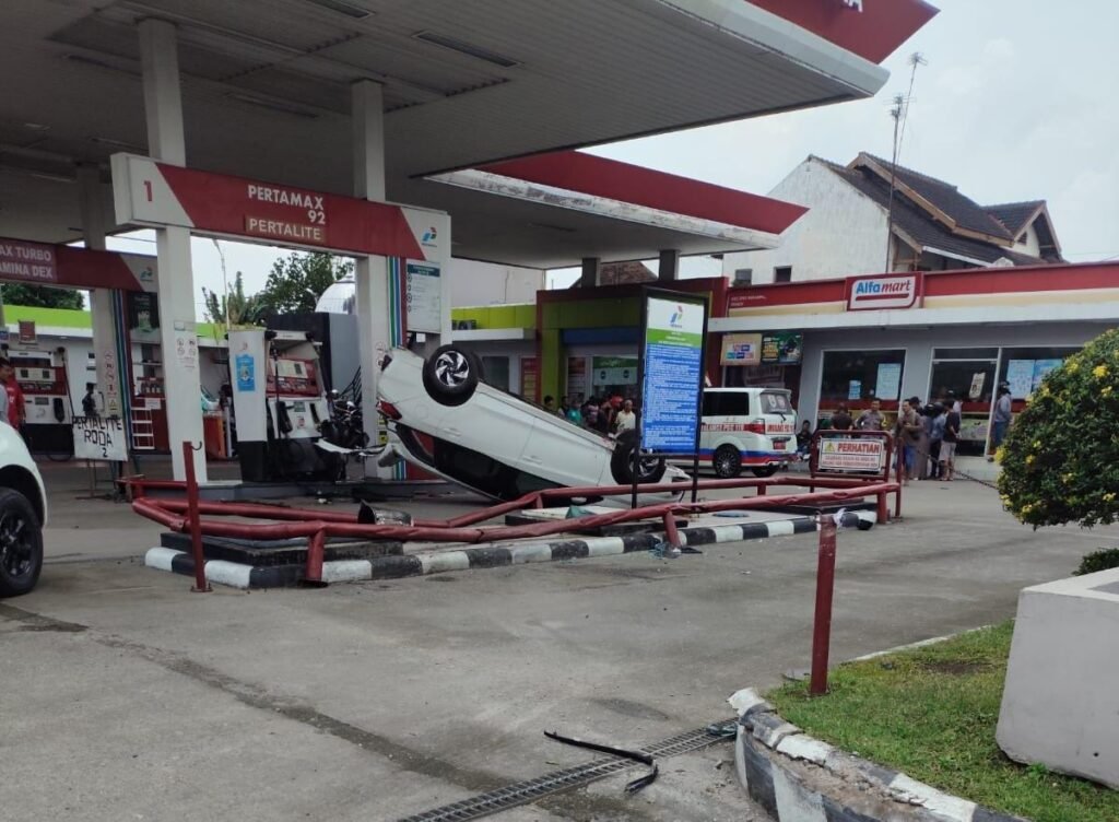 Sebuah Honda Mobilio kehilangan kendali, menabrak pembatas taman SPBU hingga terguling dan menghantam sepeda motor yang tengah mengisi bahan bakar.