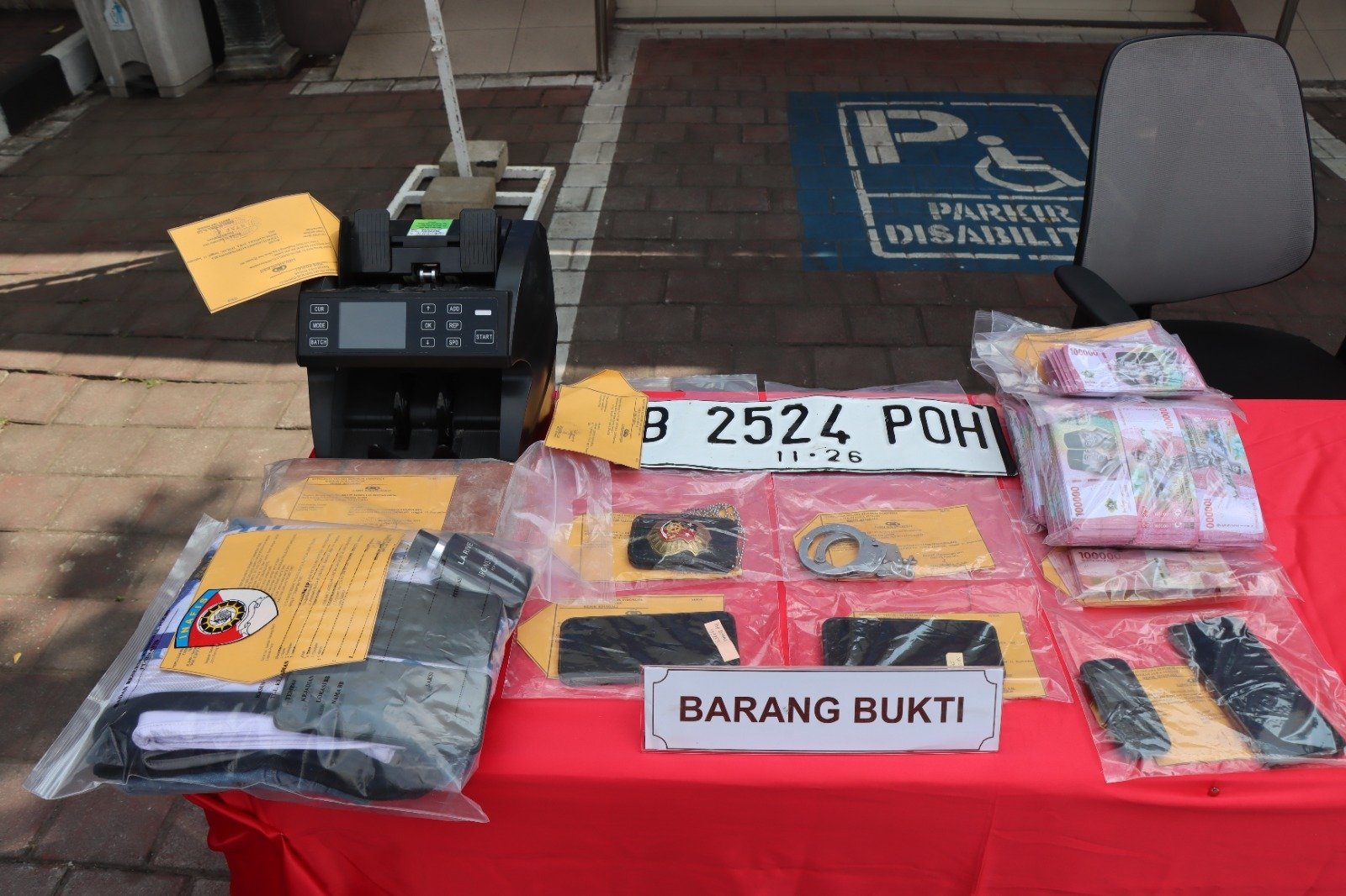 Polisi juga mengamankan sejumlah barang bukti, di antaranya 3.700 lembar uang mainan pecahan Rp100 ribu, borgol bertuliskan Polri Japan Steel, kalung lencana reserse, mesin penghitung uang, berbagai unit telepon genggam, serta uang tunai Rp3,6 juta.