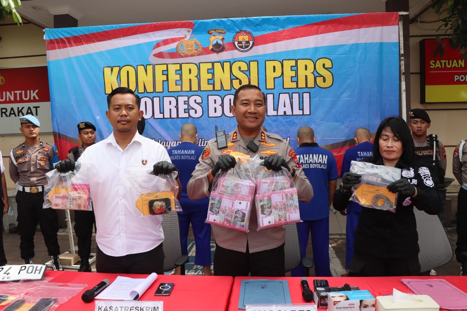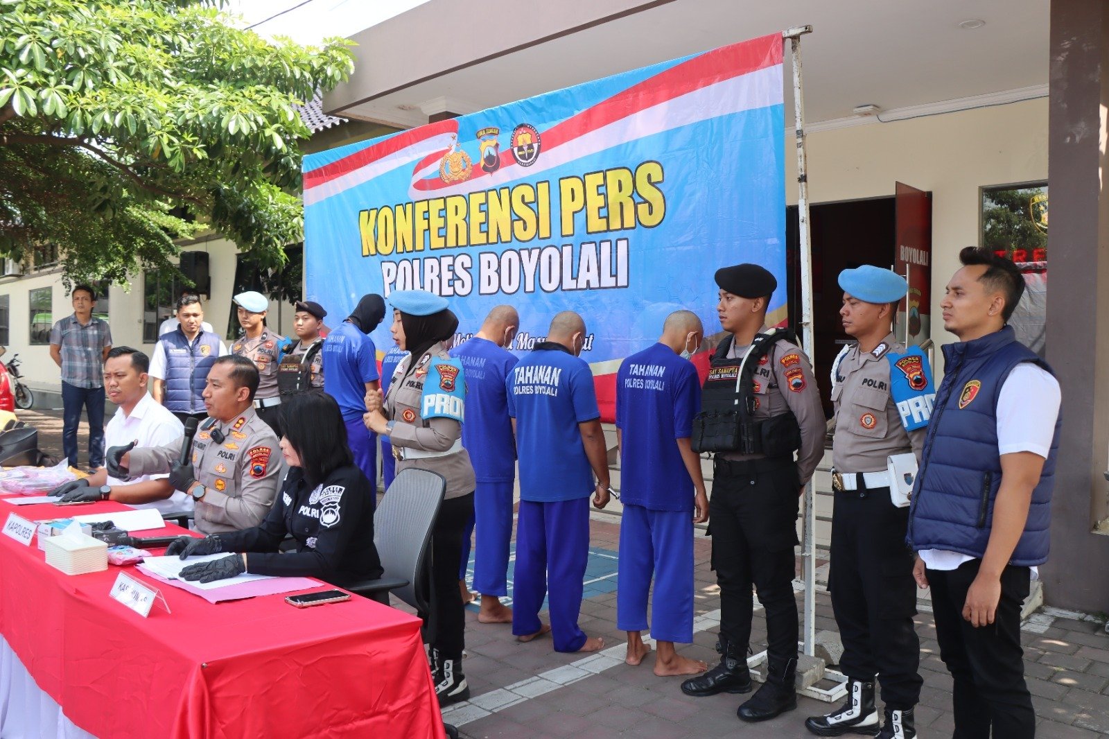 Kapolres Boyolali menjelaskan, dalam pengungkapan kasus ini Satreskrim Polres Boyolali berhasil mengamankan lima orang terduga pelaku, yakni MNB (Semarang), DWP (Salatiga), TS (Sukoharjo), RAPS (Salatiga, anak), serta HM (Tulungagung). “Kelima terduga pelaku ini kami amankan dari lokasi berbeda berdasarkan hasil penyelidikan dan pengembangan kasus. Selain itu, masih terdapat empat orang yang masuk dalam daftar pencarian orang (DPO) dengan inisial R, MKS, AG, dan MST. Saat ini pengejaran terhadap mereka masih terus dilakukan,” tegas Kapolres.