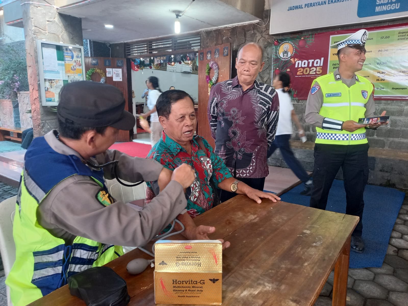 Kebumen, Jawapost.net — Seksi Kedokteran dan Kesehatan (Sidokkes) Polres Kebumen melakukan pengecekan kesehatan kepada jemaat yang mengikuti misa Natal pagi di Gereja Katolik Santo Yohanes Maria Vianney, Kebumen, Kamis, 25 Desember 2025. Kegiatan ini berlangsung di area depan gereja seusai ibadah.
