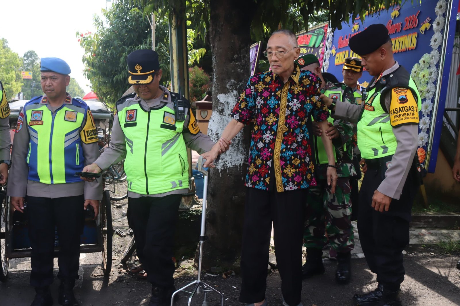 Sejumlah personel kepolisian terlihat membantu jemaat yang mengalami gangguan kesehatan, termasuk menurunkan penumpang dari kendaraan serta mendorong kursi roda menuju lokasi ibadah.