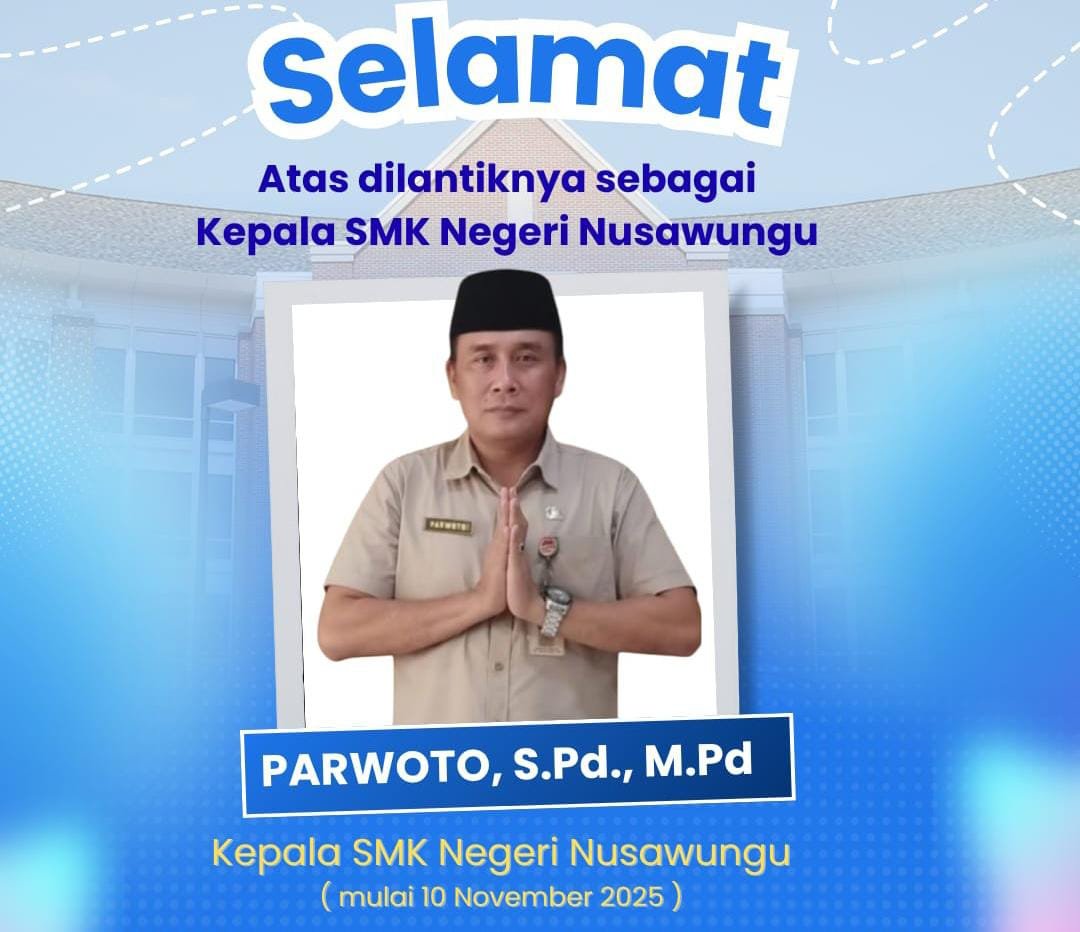 CILACAP, JAWAPOST.NET – Bapak Prawoto, S.Pd., M.Pd. resmi dilantik sebagai Kepala Sekolah SMK Negeri Nusawungu, Kabupaten Cilacap, pada Senin (10/11/2025).