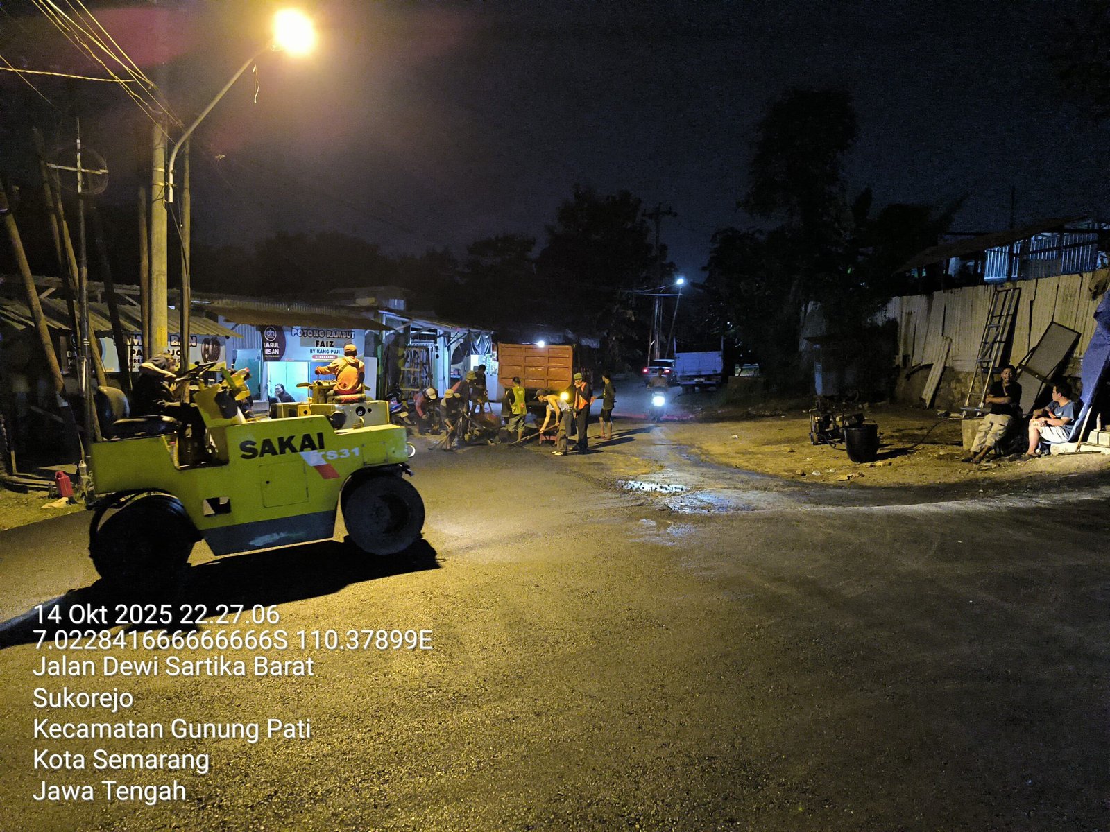 Kegiatan perbaikan tersebut dimulai senin malam (14/10/2025) pukul 22.00 WIB dan ditargetkan rampung pada Selasa pagi (15/10/2025). Pekerjaan meliputi peninggian dan penataan permukaan jalan rusak serta pemasangan saluran air (u-ditch) untuk memperkuat sistem drainase di kawasan tersebut.