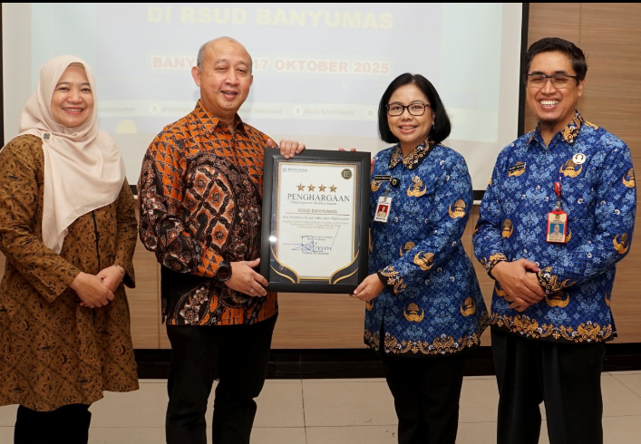 BANYUMAS (Jawapost.net) – Komitmen RSUD Banyumas dalam mengintegrasikan layanan kesehatan berbasis digital mendapat apresiasi dari BPJS Kesehatan. Direktur Teknologi Informasi BPJS Kesehatan, Dr. Ir. Edwin Aristiawan, M.M., menyerahkan langsung Sertifikat Bintang 4 kepada RSUD Banyumas, Jumat (17/10/2025), sebagai bentuk penghargaan atas keberhasilan rumah sakit tersebut dalam menerapkan berbagai sistem digital pelayanan kesehatan.