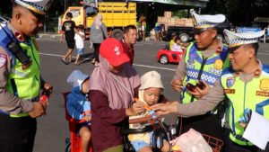 Dalam kegiatan tersebut, sejumlah polisi wanita mengenakan pakaian adat dan berinteraksi langsung dengan masyarakat, didampingi maskot badut Zebra yang menarik perhatian anak-anak.