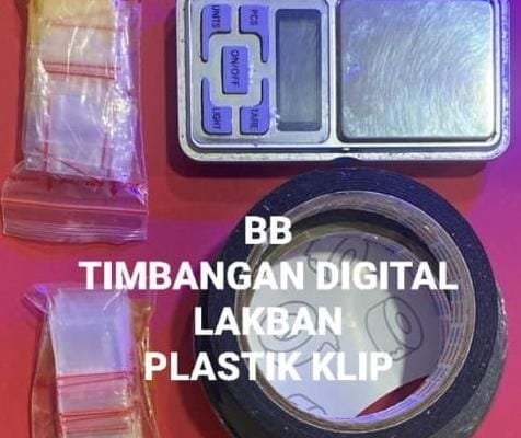 Petugas juga mengamankan barang bukti lainnya berupa 1 (satu) unit sepeda motor honda Beat warna hitam yang digunakan sebagai sarana oleh tersangka, 1 (satu) unit HP, 1 (satu) buah timbangan digital serta lakban dan plastik klip.