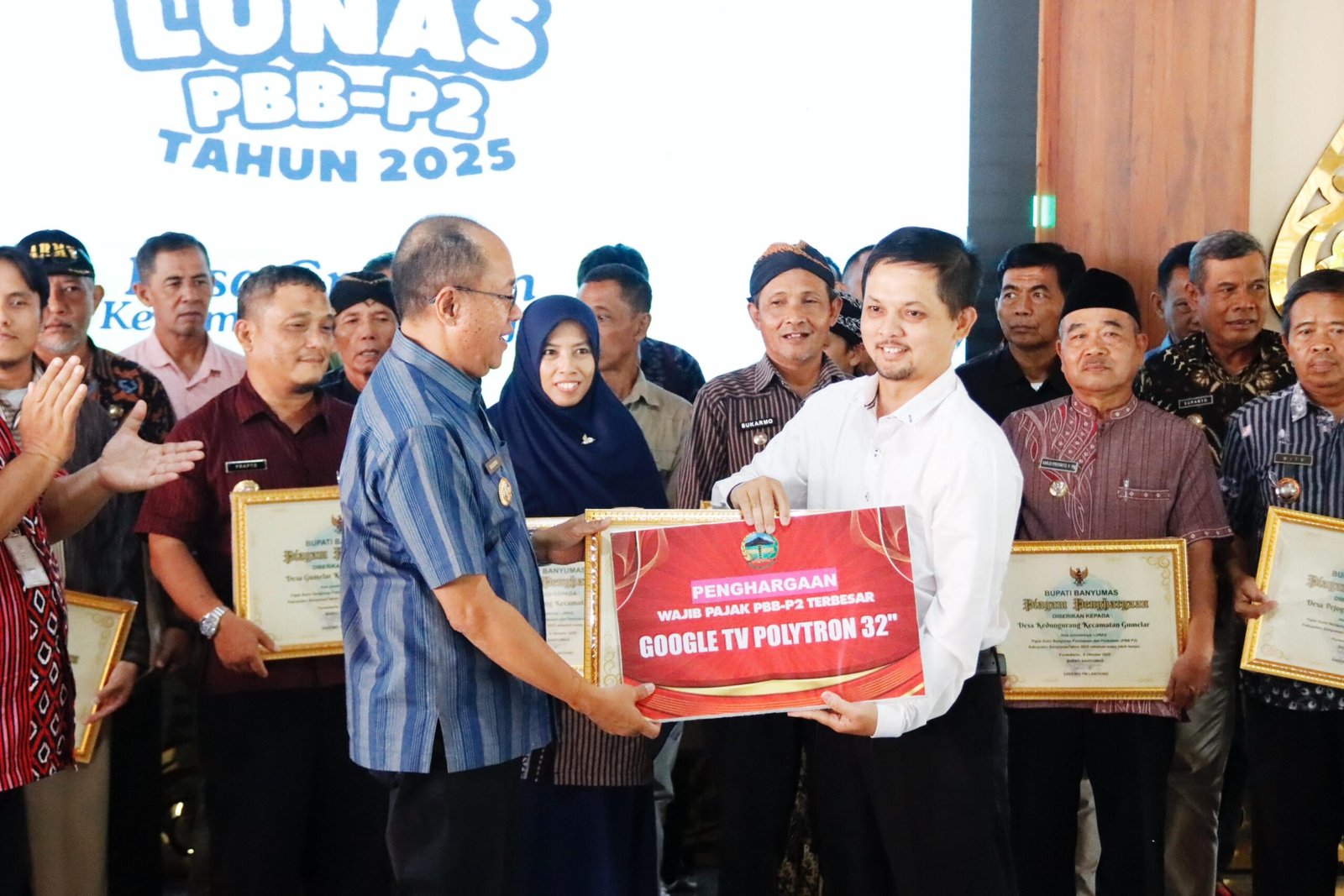 Dalam kesempatan tersebut juga diberikan penghargaan kepada 40 desa yang telah melunasi PBB-P2 tahun 2025, wajib pajak dengan nominal pembayaran terbesar yakni PT Rita Ritelindo Purwokerto, serta desa tercepat melunasi PBB-P2 yaitu Desa Tlaga, Kecamatan Gumelar, yang telah mencapai 100 persen pada 19 Juli 2025.
