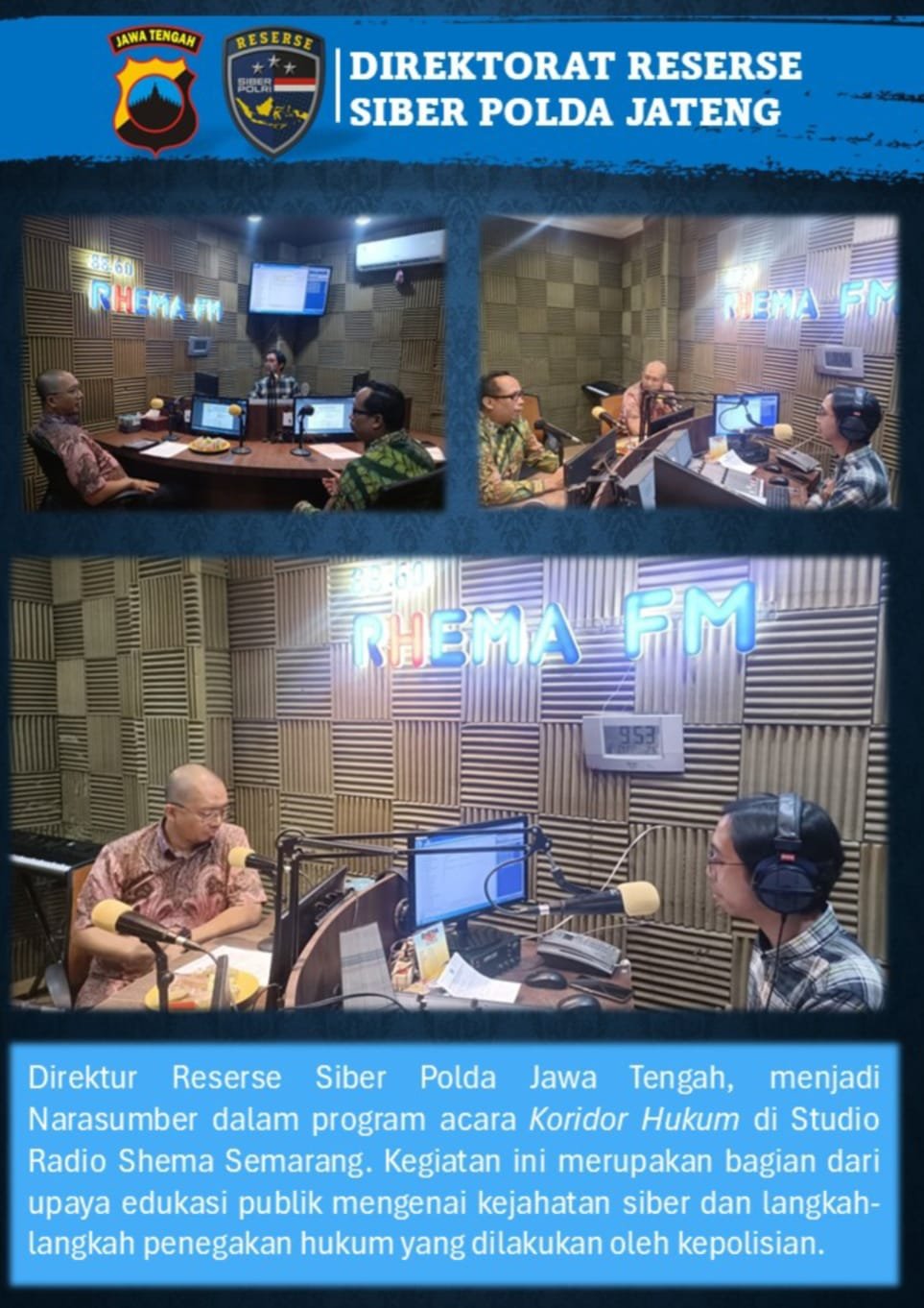 Tak hanya itu, di hari yang sama pihaknya juga menjadi narasumber dalam program Koridor Hukum di Studio Radio Shema, Kota Semarang. Kegiatan ini merupakan bagian dari upaya edukasi publik mengenai kejahatan siber dan langkah-langkah penegakan hukum yang dilakukan kepolisian.